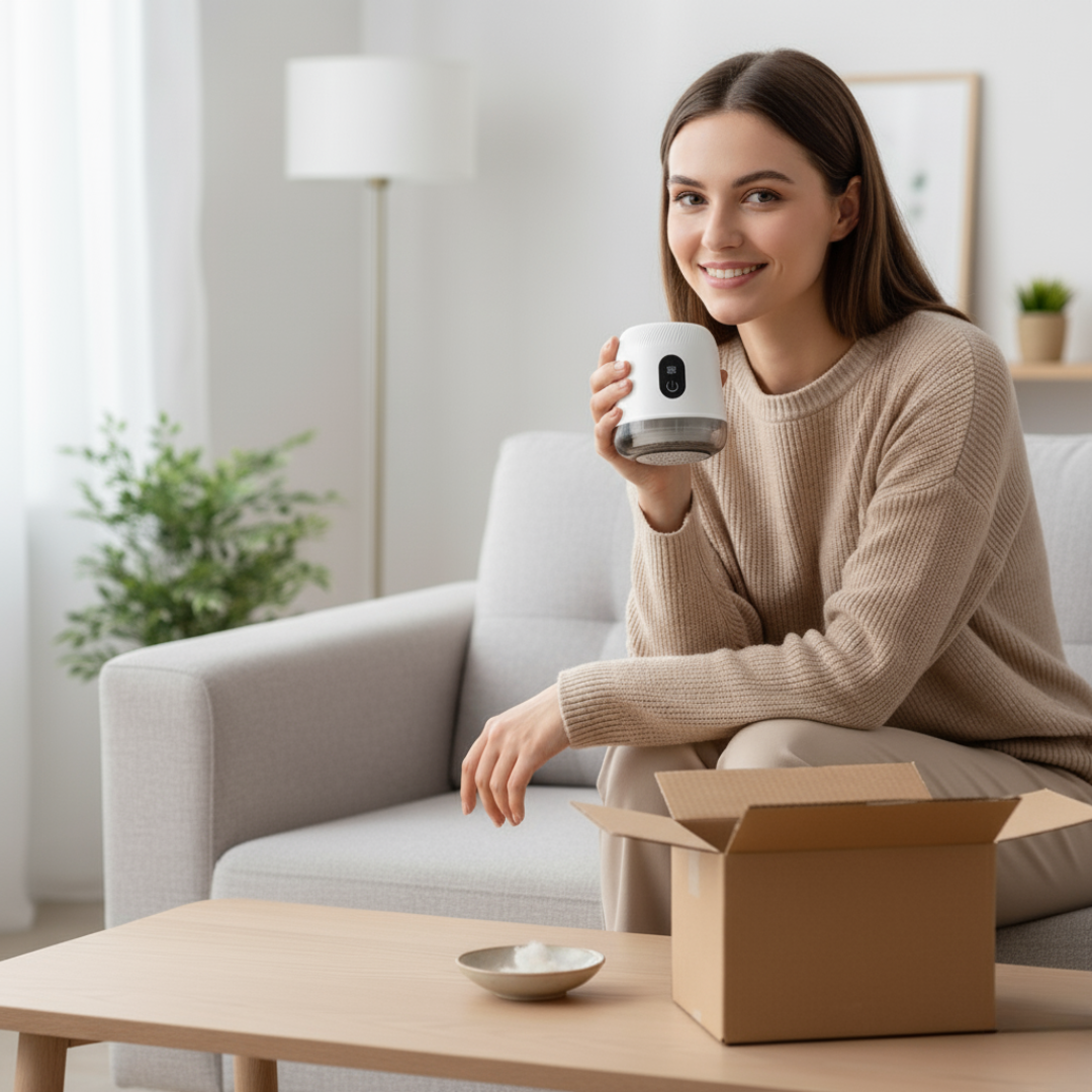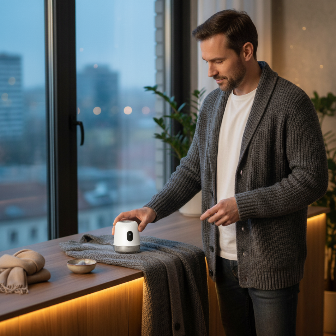 Fuzora™ działa cicho i delikatnie, po kawałku – od swetra do pracy, przez koc „po psie”, po bluzę na uczelnię. Bez pośpiechu, bez stresu: lekkie 100 g w dłoni, pojemnik trzyma porządek, a Ty po prostu wracasz do swoich ulubionych ubrań.