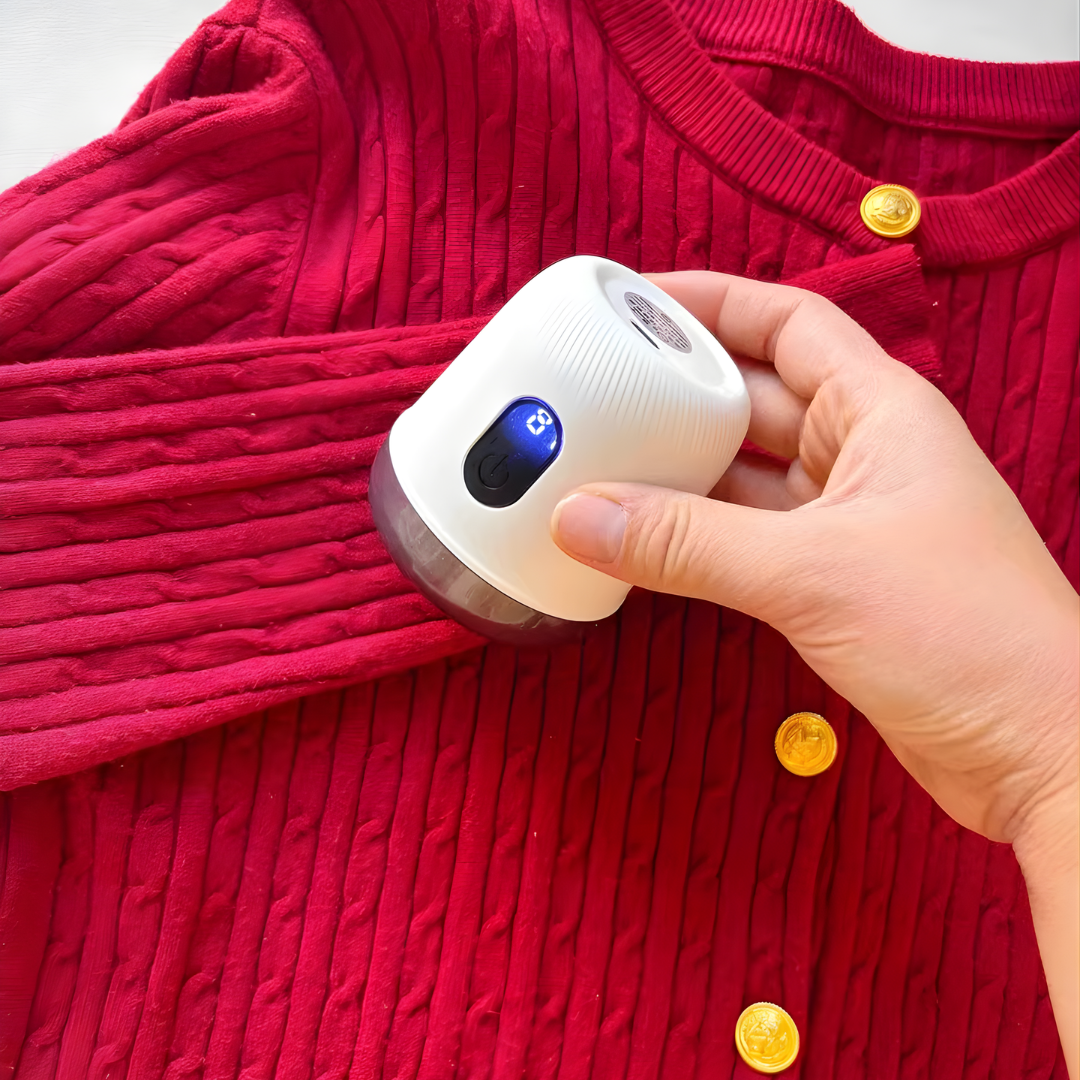 Fuzora™ powstała z drobnych irytacji: sweter po praniu wygląda „zmęczony”, na kocu po filmie pełno kuleczek i sierści. Kilka spokojnych przesunięć 6-łopatkowej głowicy zbiera zmechacenia, a osłona z safety-stopem chroni wełnę i kaszmir.