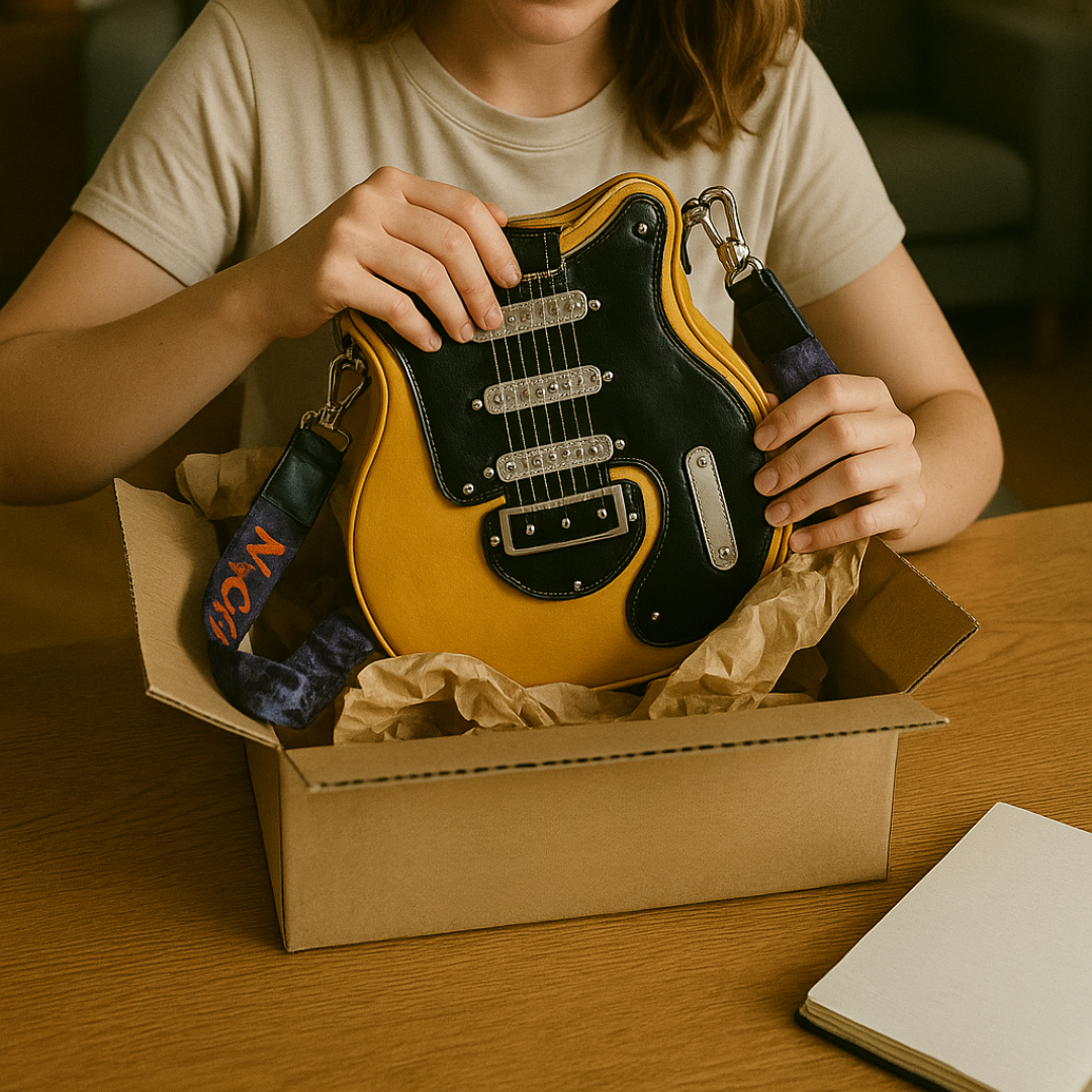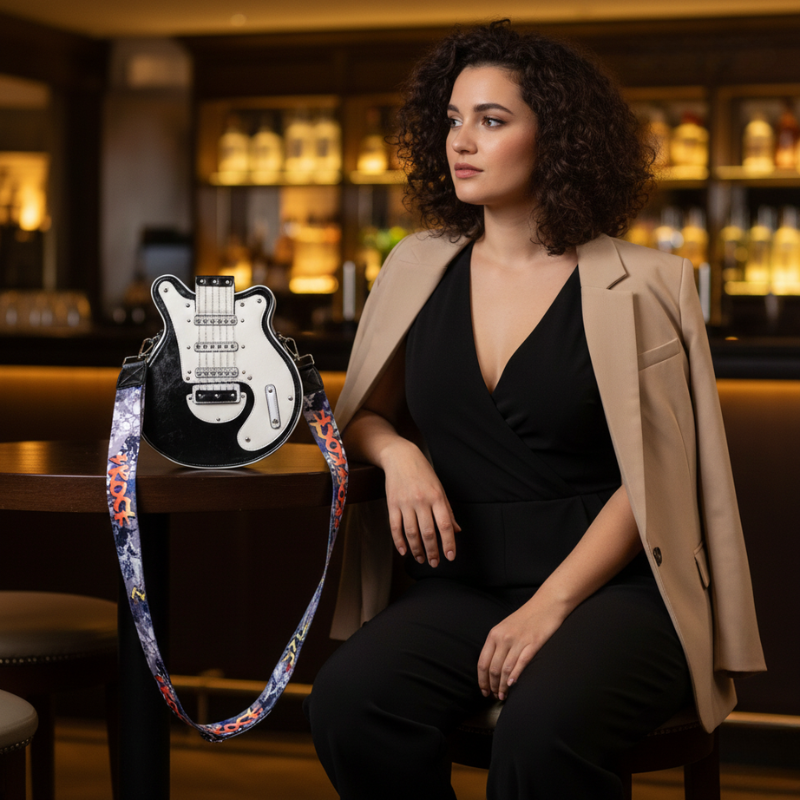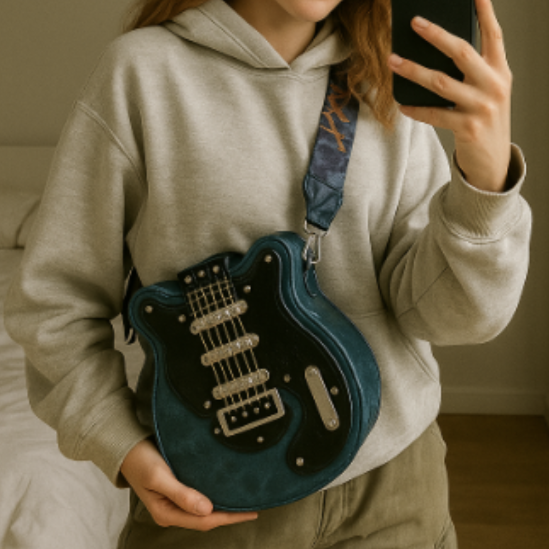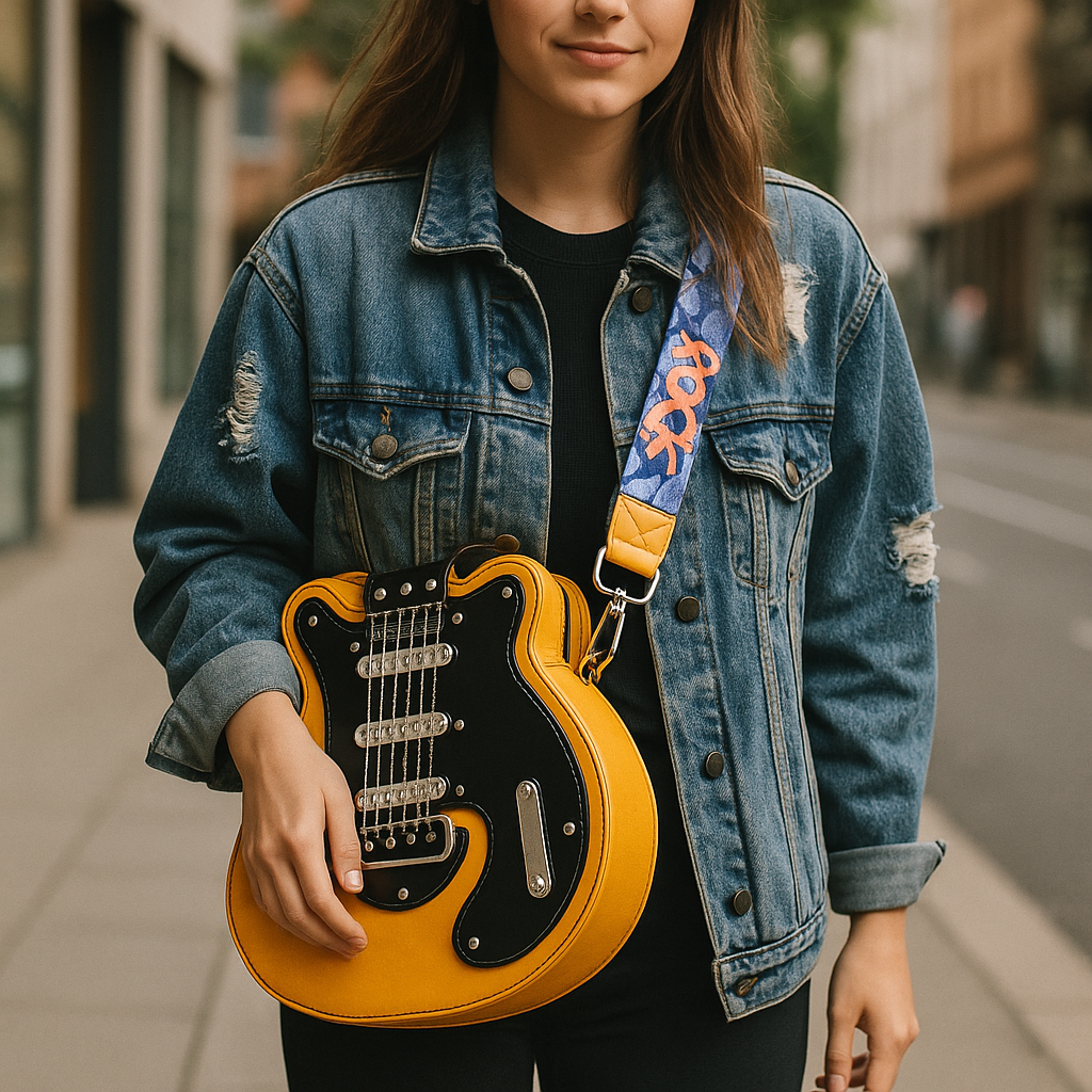 Z Guitarista™ każdy dzień nabiera rytmu. Ikoniczny kształt gitary sprawia, że zwykły T-shirt i jeansy nagle wyglądają jak stylizacja z koncertu. To nie jest zwykła torebka – to Twój głos w świecie mody, od randki po festiwal.