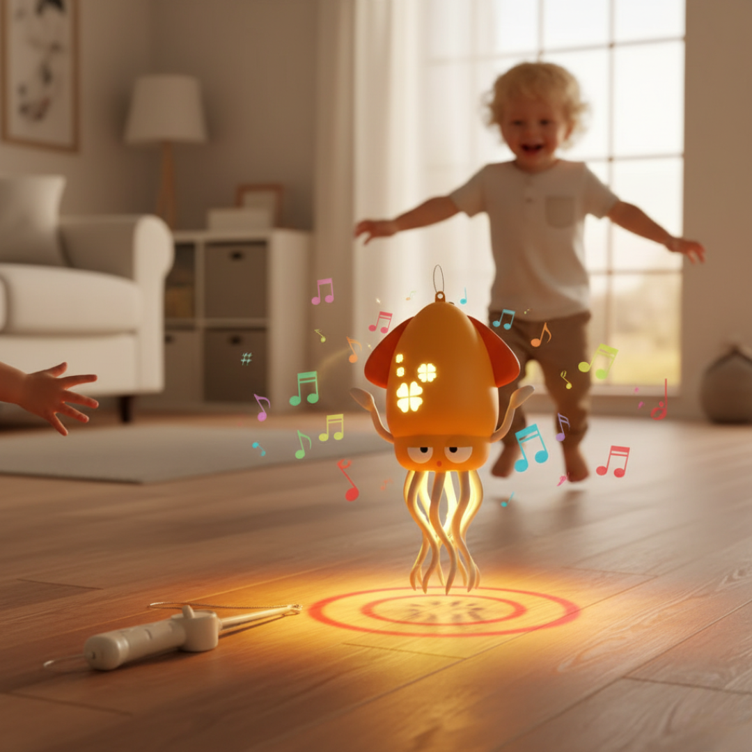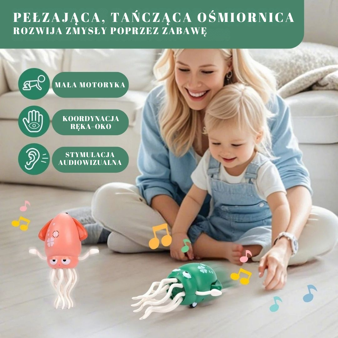 Pozwól swojemu maluchowi śmiać się, tańczyć i odkrywać razem z magiczną tańczącą ośmiornicą! Ten inteligentny, kolorowy towarzysz zabawy zaczyna się poruszać i świecić, gdy tylko go włączysz. Dzięki radosnej muzyce, świecącym diodom LED i ośmiu bujającym się mackom, każda chwila zabawy staje się świętem.